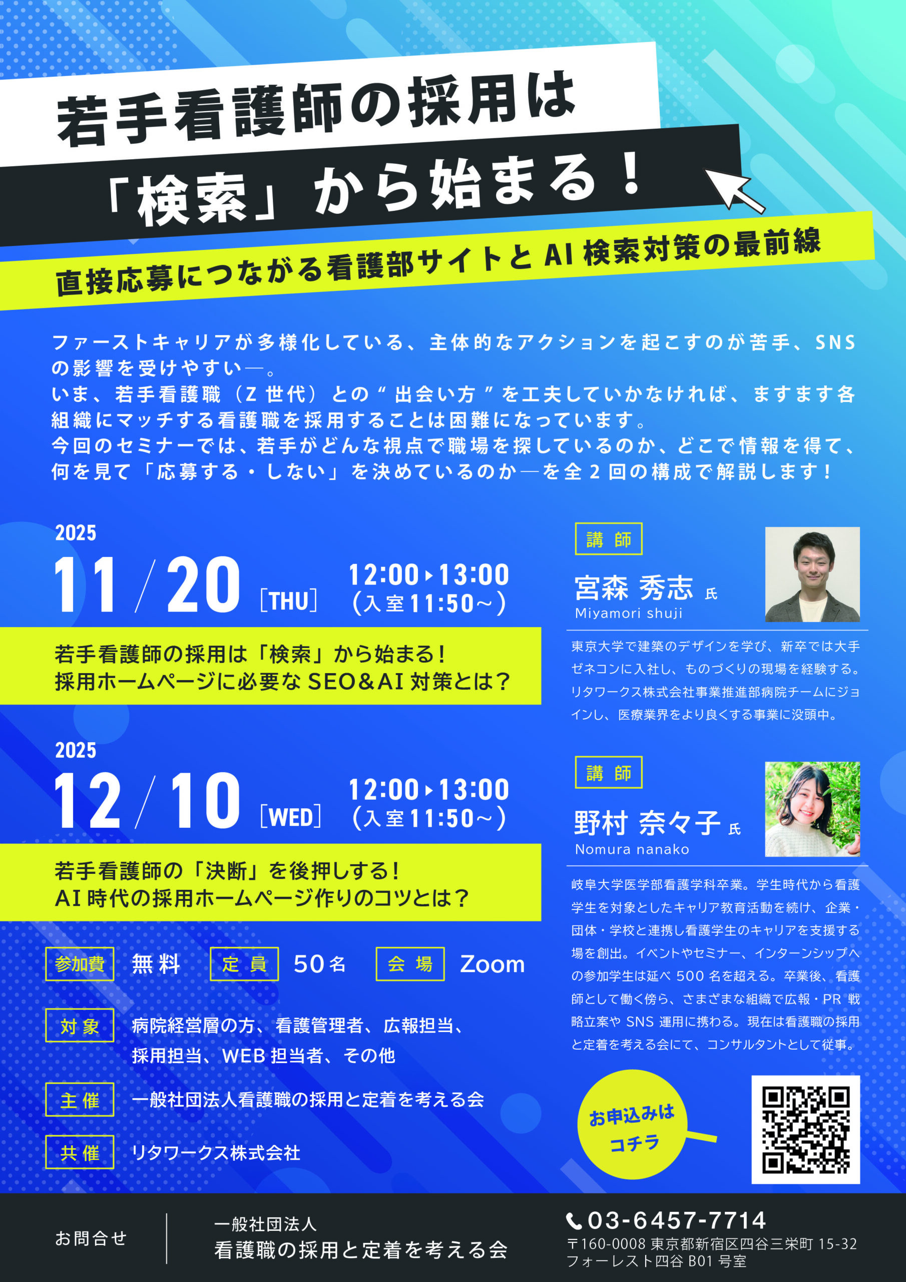 11月20日(木):若手看護師の採用は「検索」から始まる!採用ホームページに必要なSEO&AI対策とは?【総論】